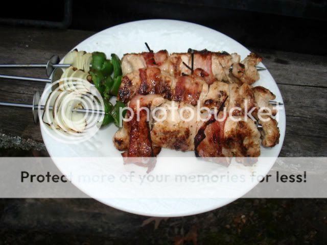 This turned out mighty good. I took 1/2 of a wild turkey breast and cut it into chunks and marinated in Italian Dressing. I then wrapped bacon around the chunks and secured with toothpicks and placed on the skewers. I seasoned it with salt, pepper, and lemon pepper. I also had placed oninon and bell pepper on the skewers. I cooked them over hot coals, turning regularly every couple of minutes. I cooked them until the bacon got brown and started to get crisp.