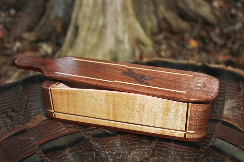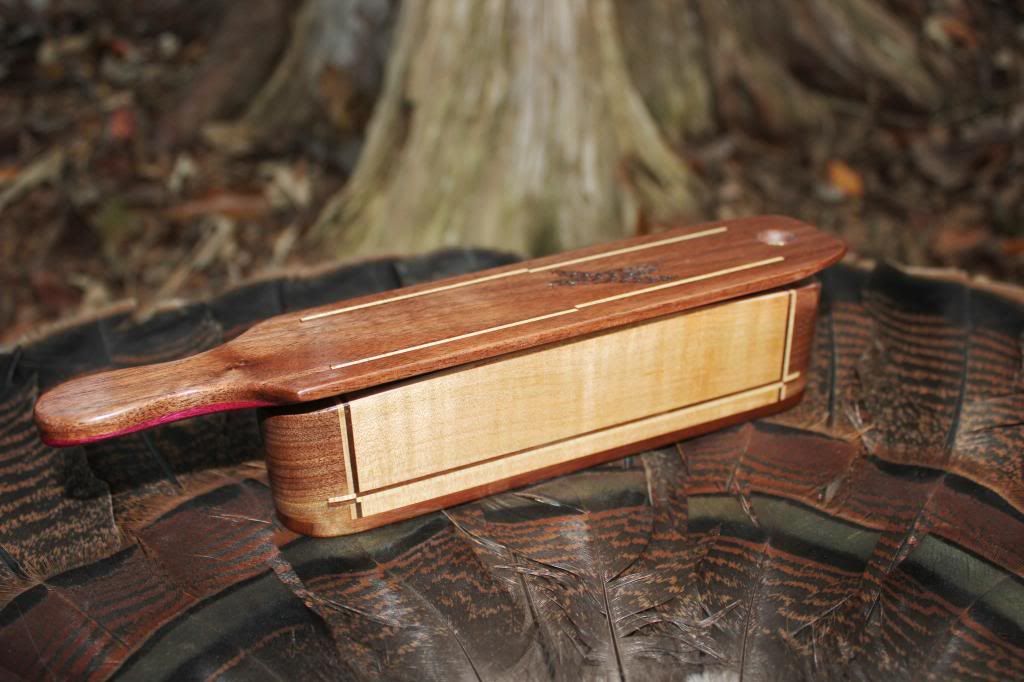 Opened me a package from Ohio the other day and none other than this little babe was inside.....Its a Shadetree -parquet turpin. She's a real player too. Subtle yelps that will wind up also, great clucks and one heck of a gobble let me say. She's really sharp and easy on the eyes also. Take a close look at how Bob creatively did the inlays on the body and the lid. Maybe Bob can elaborate on how many pieces of wood he used to make up this parquet--I think I remember it was like 42 different pieces. Thanks Bob for a great call...