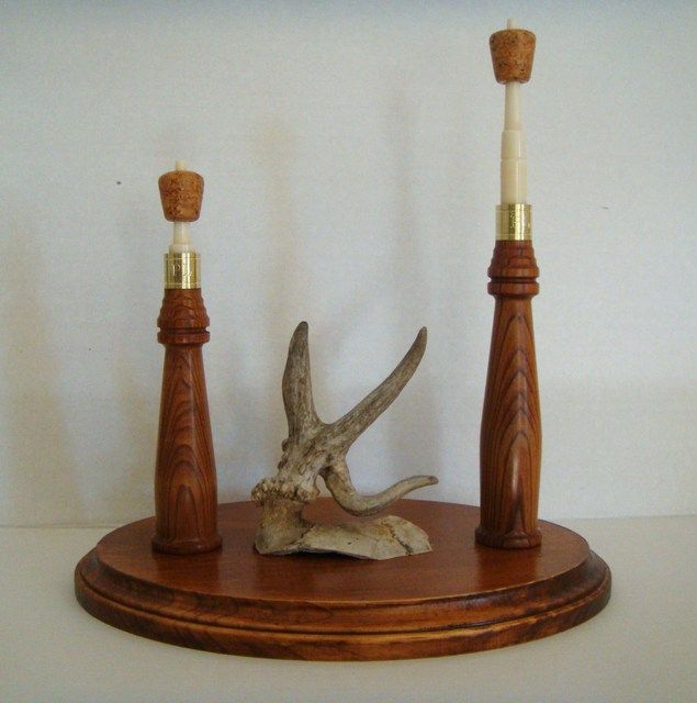 The Cypress used in this set came from the original cistern of the Dixie Brewing Company in New Orleans.  The cistern was installed in 1907.   After five years and the receipt of a funky antler that was requested I incorporate into the display, I got inspired to complete the set.  Calls are a Jug call and Roanoke Trumpet, two of my original designs.