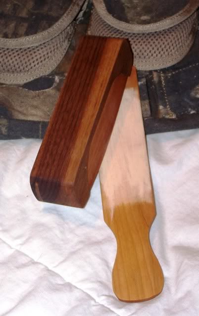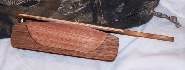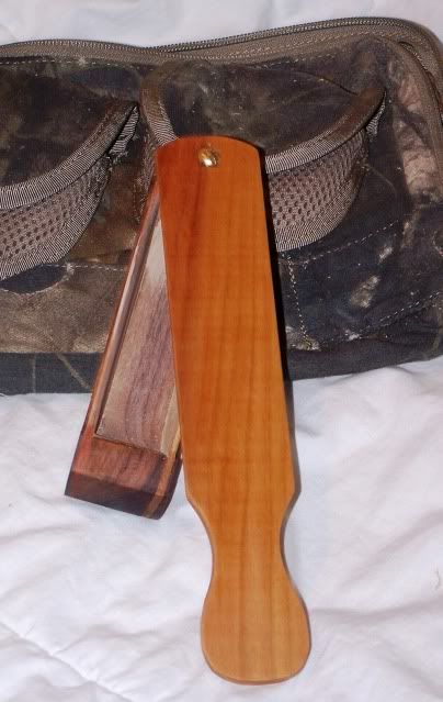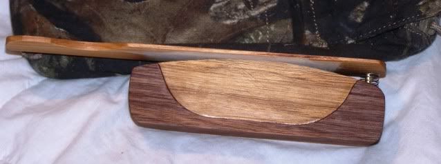 this is a half moon box with a walnut base cherry paddle with one side butternut and the other mohagany....