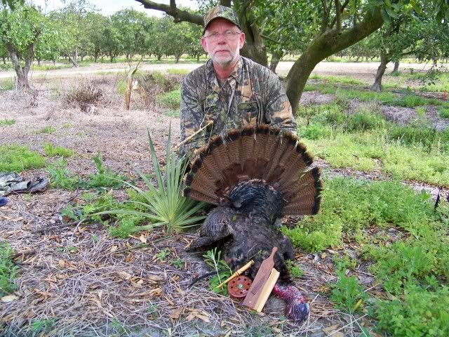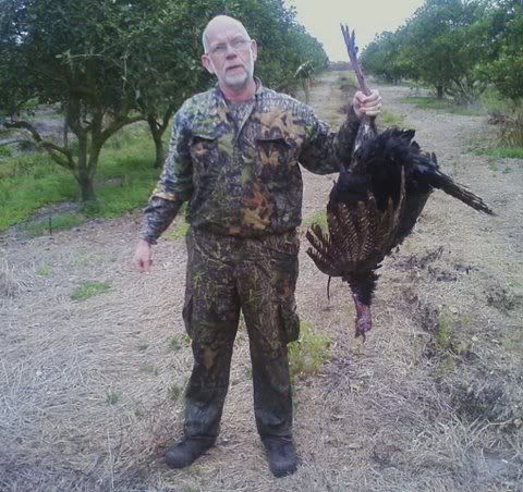 I guess I will tell the story as Al told it last year:  Ted recently took a trip to Florida, and overcome tremendous odds to wreak havoc on the birds down there. Nothing was gonna stop Gatorman from gettin his birds. The trip with Dave was bad enough, but once there things got even worse. I know on one of his birds he had to risk his life to get the bird.  From what I understand, he shot a gobbler across some water that was supposed to be ankle deep. Turns out it was only ankle deep if you were standing on your head!!!     But that didn't stop Gatorman from gettin his bird. He dived right in and fought his way through the gator infested water and retrieved his bird!!! Way to go man!!! One thing that impressed me more than Ted's determination to get his bird was his friend Dave's (Longbeard27) true friendship to Ted. He made sure Ted didn't miss out on getting a pic of this GREAT moment!!! Dave is a true friend to Ted. Here's a pic of Ted and his bird. I'm not sure how the Gator faired. When I talked to Ted about it, he kept changing the subject!!