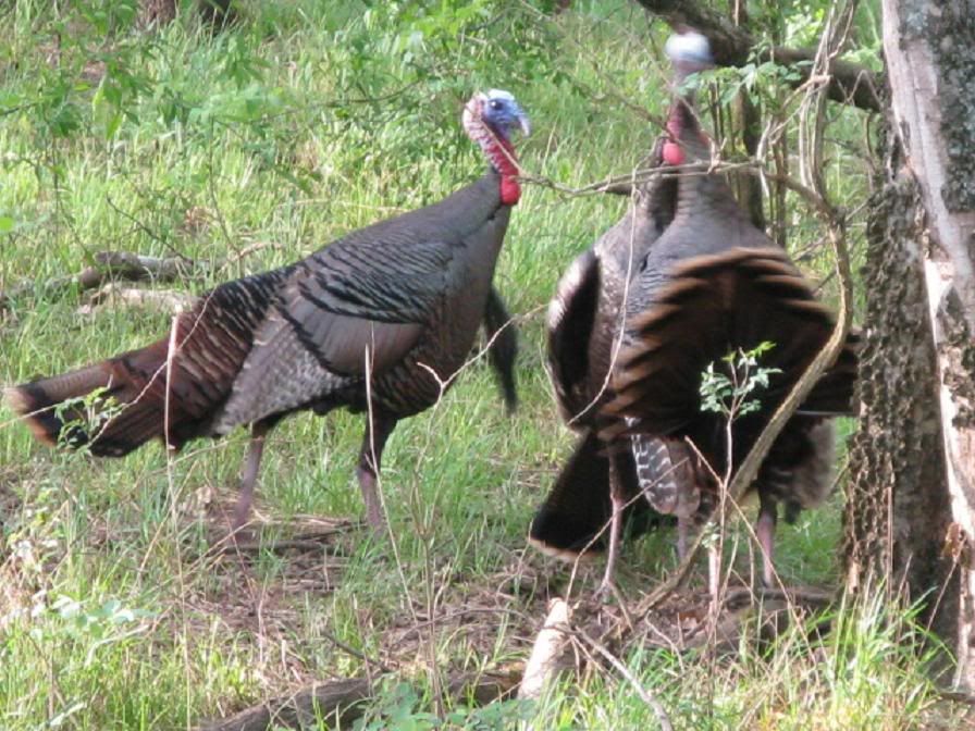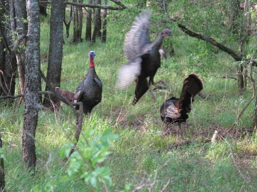 I witnessed them last year... that was after Daryl blew their ear drums out! Honestly (everyone has heard the story) but Daryl and I walked up on about 15 birds sleeping in Kansas. The wind was blowing so hard, we never did see them and we had just called about 15 yards away. Daryl whipped out his copper pot and started cutting and yelping aggressively. We were a mere 10 yards from the birds when they woke up. They were all asleep on the GROUND... Now Daryl and I were not even walking quietly and we were definitely cutting up and laughing loud. I've never seen anything like that! Most of the times here in MO... if that wind is howling, the birds are in the middle of the field watching!