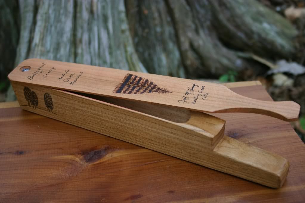 Its a butternut under Cherry-the cherry even has a little figuring in it. It will tune down ---the kee kees are screaming, gobbles great...and has a good break in it. Guess I got lucky on this one. Did a little of the new woodburning on it.